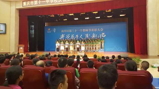 2015年9月9日,在十一中的文益堂里响起了洪亮的朗诵声。这是由初2017级7班献给所有老师教师节的赞歌与祝福——《九月飞歌》。整齐的着装,充满激情的朗诵,每人手捧玫瑰。台上,我们神采飞扬,激情澎湃。可是,你知道吗?我们从接到演出任务到上台表演,总共只有2天时间。在这短短的两天时间里,我们在张雪静老师的指导下,完成了文稿撰写、选拔人员、合练、踩台等艰巨任务。同学们休息时,我们在操场旁努力排练;同学们玩耍时,我们在教室里拼命记词。但我们无怨无悔,因为我们知道,老师们为了我们的健康成长奉献了更多,我们应该在教师节来临的时候给亲爱的老师们送去最真诚的祝福。我们的辛苦付出换来了老师的阵阵掌声,这就是给我们最高的奖励。
