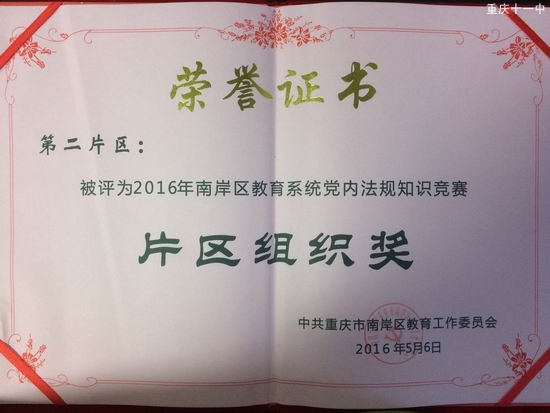 2016年3月31日,区教育纪工委于开展了教育系统党内法规知识竞赛团体赛(初赛)活动,由我校教师组成的第二片区荣获区教育系统党内法规知识竞赛团体赛(初赛)组织奖。