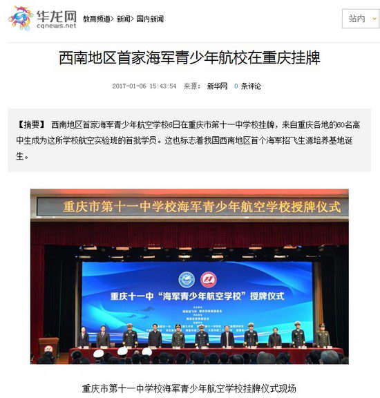 【摘要】 西南地区首家海军青少年航空学校6日在重庆市第十一中学校挂牌,来自重庆各地的60名高中生成为这所学校航空实验班的首批学员。这也标志着我国西南地区首个海军招飞生源培养基地诞生。