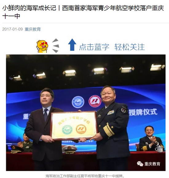 1月6日,重庆市第十一中学校海军青少年航空学校授牌仪式举行,来自重庆各地的60名高中生成为这个学校航空实验班的首批学员,这标志着我国西南地区首个海军招飞生源培养基地诞生。