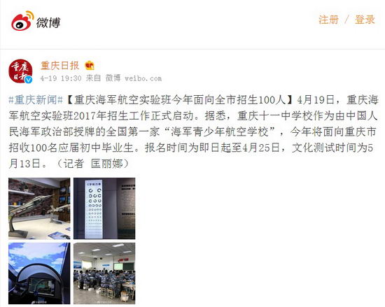 [重庆日报的微博]重庆海军航空实验班今年面向全市招生100人