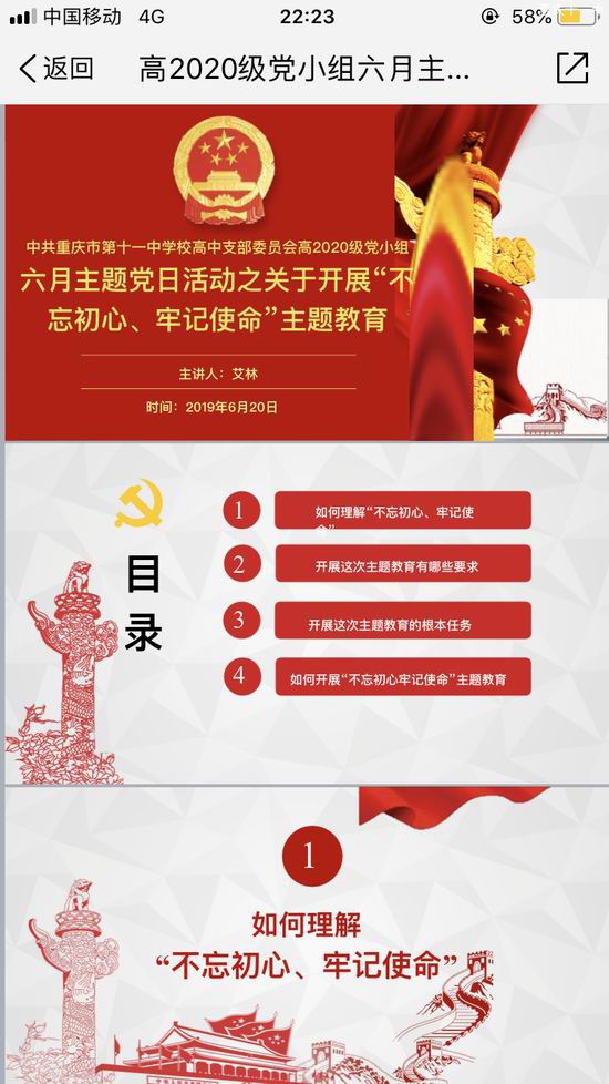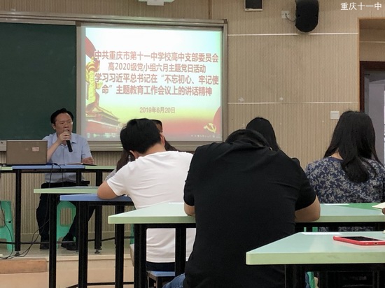 5月31日,习近平总书记在“不忘初心、牢记使命”主题教育工作会议上发表了重要讲话,深刻阐述了开展主题教育的重大意义,深刻阐明了主题教育的目标要求和重点措施,对开展主题教育提出了明确要求。6月20日,中共重庆市第十一中学校高中委员会高2020级党小组在高二下期末即将来临高三工作即将启动的大背景下在博文楼四楼多媒体教室组织年级全体党员开展了 “不忘初心、牢记使命”主题教育活动,会议由党小组长刘东华主持,支部委员兼高2020级年级主任艾林同志主讲。