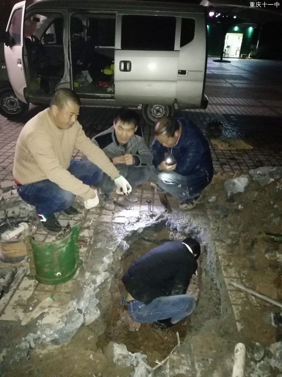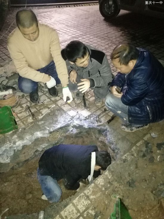最近,在没有工程用水、抗旱用水、消防用水等特殊情况下,与同期相比学校用水量有所增加,甘阳春觉得可能有异常情况,通过自己日常积累的经验分析对比,初步判断是地下管网漏水所至,但究竟是哪里漏?是一个漏水点,还是多个漏水点?无法确定,为了搞清楚这个问题,甘阳春真可谓下“血本”了,有时三更半夜、有时在黎明之前、有时是休息时间,他分地域、分时段,一个阀门一个阀门的关闭、读表、记录,再一个阀门一个阀门地开启,再读表再记录,经过一段时间的数据比对和细心观察,大致判定漏水点在体艺馆附近。由于地下水管埋得较深,看不见走向、摸不着大小、听不到声音,只得借助专业队伍专用设备进行有针对性的探测。专业探测也只能在甘阳春的指引下进行,在怀疑的重点区域探测才有实效。找到漏水点,利用周末及时开挖、舀水、打磨漏眼、封堵、上夹板等,一系列流程做下来天色已晚,在寂静的校园里,施工的点点亮光格外显眼。处理好一个漏水点之后,用水量减少了许多,责任心极强的甘阳春仍然不放心,担心还有其他漏水点,为了彻底消除漏水病根,甘阳春和我们自己的工人一起把井盖打开,一个井一个井的查,不顾弄脏衣服损毁皮鞋,亲自下到井底细心观察,有时在井下一蹲就是20分钟甚至更长,观察流水量的大小和流水的清与浊的变化,果不出所料,又发现了第二个漏水点,在距处理第一个漏水点一周时间,同样是星期六,重复着开挖、舀水、打磨漏点、封堵、上夹板等程序。水表的读数正常了,学校的用水量正常了,甘阳春的脸笑了。