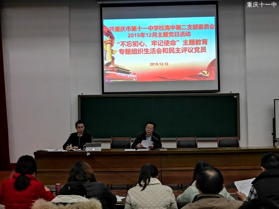 2019年12月12日晚上6点,中共重庆市第十一中学校高中第二支部委员会全体党员聚集在重庆十一中CBD校区报告厅,召开“不忘初心,牢记使命”主题教育专题组织生活会和民主评议党员大会,大会由高中第二党支部书记艾林同志主持,校党委委员、副校长谢晓斌同志参加会议。