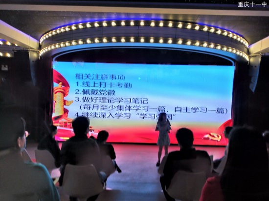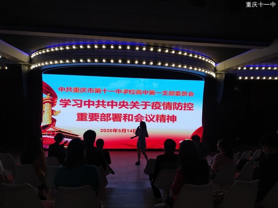 5月14日下午,重庆市第十一中学校高中第一党支部在青年剧场召开党员大会。宣传委员余飞扬老师带领全体党员学习中共中央近期相关会议精神。
