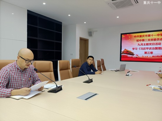 2020年9月22日16:00,重庆市第十一中学校初中第二支部委员会组织全体党员同志在文德中学校的圆桌会议室里开展了2020年9月份的主题党日活动,本次学习的主要内容是学习《习近平谈治国理政》第三卷。