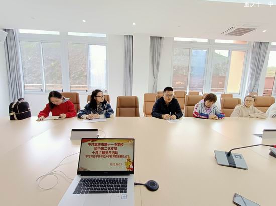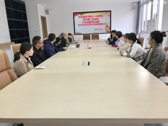 2020年10月22日11:00,重庆市第十一中学校初中第二支部委员会组织全体党员同志抽出时间在文德中学校的圆桌会议室里开展了2020年10月份的主题党日活动,本次会议的议程有两个:一是学习《习近平关于教育的重要论述》,二是传达学校党务工作会的重要精神。
