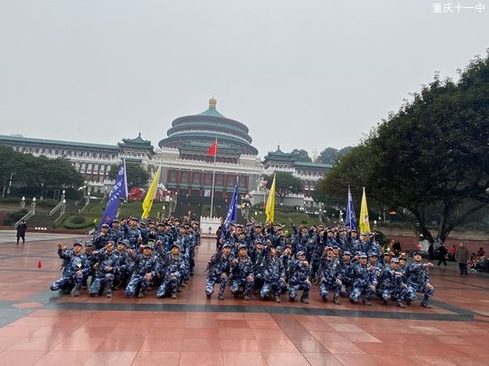 队伍离开南岸区后,在确保安全的情况下,我们跨过长江大桥,越过崎岖难行的石板坡山城步道,来到了重庆最具历史气息的地方——渝中区。经过交错复杂的道路,海航学员们来到了重庆市人民大礼堂,合影留念后,学员们将提前精心准备的纸飞机送给了路边的市民,向周边市民介绍了海军青少年航空学校,得到了市民的一致赞许。