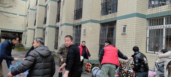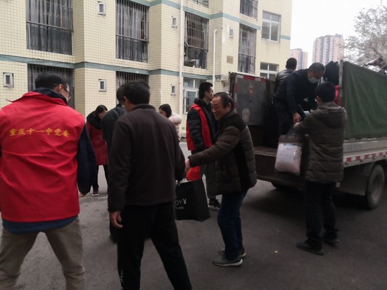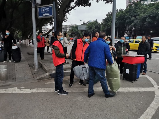 行李较多的学生把生活用品整理打包,搬运到候车区等候货车的到来,静候、排队、上车,不拥不挤,不骄不躁。每趟车到,党员队伍总是冲在前面,与家长和年级老师们争先恐后搬运行李,丝毫不顾虑行李的沉重,大家相互传递,分工协作,天虽微冷,但这场景却热火朝天。