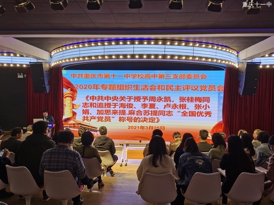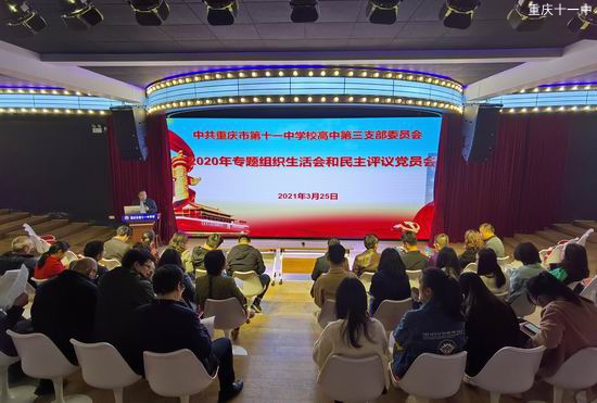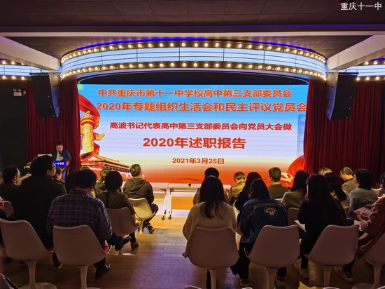 2021年3月25日,重庆市第十一中学校高中第三党支部于青年无界剧场开展三月份组织生活会。本次会议共分为四项议程。第一项议程:高波书记带领全体党员同志一起学习《中共中央关于加强党的政治建设的意见》和《中共中央关于授予周永凯,张桂梅同志和追授于海俊、李夏、卢永根、张小娟、加思来提▪麻合苏提同志“全国优秀共产党员”称号的决定》;第二项议程:高波书记作2020年度党支部书记抓基层党建工作述职报告《重视学习要素养,落实制度讲担当》;第三项议程:全体党员对支部委员会民主测评;第四项议程:高波书记代表支部班子总结发言。