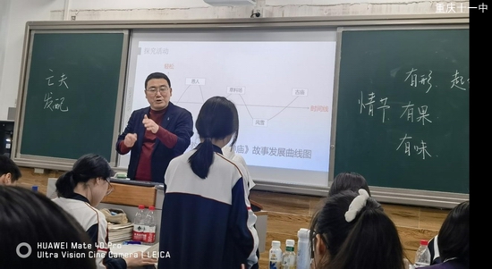 熊健老师以一部电影《隐秘的角落》导入,迅速切入文本让学生梳理《祝福》《林教头风雪山神庙》的情节。老师善于启发学生,电视剧共12集,每一集都有一个简单的标题,那么我们的两篇文章又应该怎样给出一个小标题呢?熊老师创设情境:作为中国未来十大杰出编剧之一的你,汪峰团队请你出山,把这两篇文章拍成视频,为建党100周年献礼,那么你如何根据剧情设置小标题?同学们在这样的任务引领下,勇敢地站上了讲台,给出了精彩的答案。
