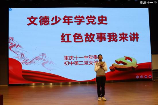 我校“文德少年学党史,红色故事我来讲”党史故事演讲比赛成功落幕啦!在重庆十一中党委初中第二党支部的组织下,3月17日至4月15日,初2023级全体同学“学党史、感党恩、知党情、跟党走”,以党史故事演讲比赛来向中国共产党百年华诞献礼。