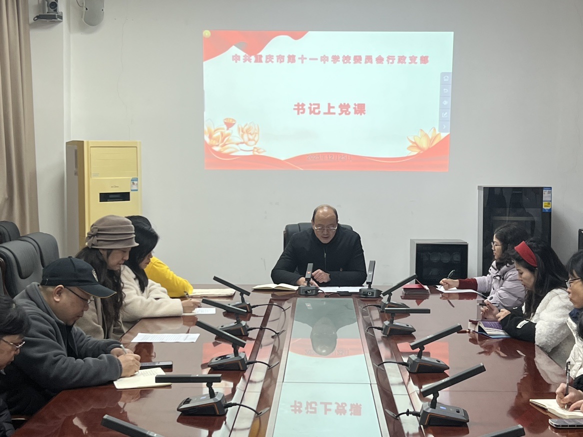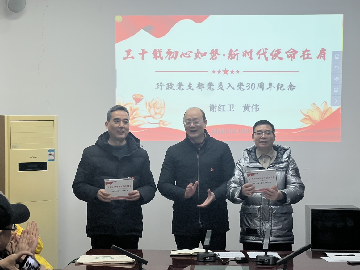 赓续光荣传统,永葆入党初心。 会议最后,特别设置了庄严而温馨的政治生日庆祝环节。党支部向党龄满30周年的老党员谢红卫校助、黄伟主任表达了崇高敬意并致以诚挚慰问。随后,为在12月份加入中国党组织的谢红卫、鲁家煜、刘畅、郑波四位同志集体庆祝“政治生日”。支部书记向过“政治生日”的党员赠送了学习书籍和政治生日贺卡,勉励他们不忘初心、牢记使命。最后,在支部书记的领誓下,全体党员面向党旗,重温入党誓词,铿锵有力的誓言回荡在会场,表达了为党的事业不懈奋斗的坚定决心。