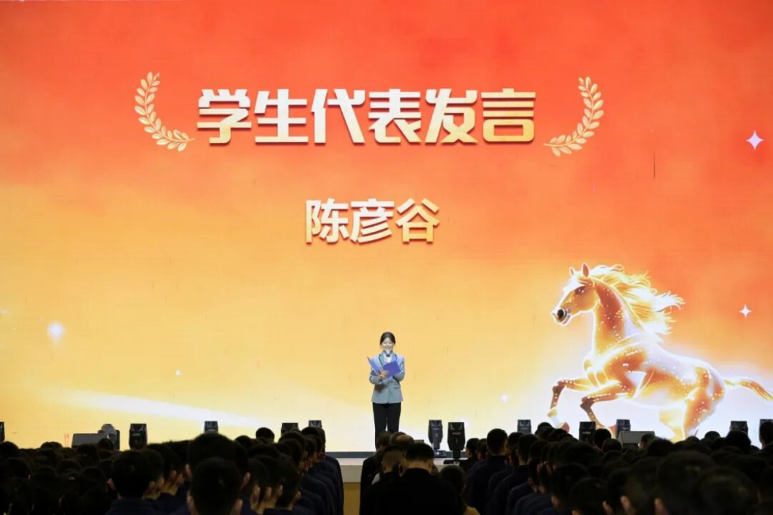 随后,高2027届3班陈彦谷同学作为学生代表发言。她以苏翊鸣、徐梦桃、宁忠岩等冬奥健儿的拼搏故事为引,与同学们共勉:“别把目标挂在墙上,要把它揉进每一天的早读和晚自习,让每一份坚持都有回响;别让他人的分数定义你的输赢,今天比昨天多懂一道题,今天比昨天多努力一分钟,你就是自己的冠军。”她号召大家以校园为赛场,默默耕耘、超越自我,让奋斗成为青春最亮丽的底色。